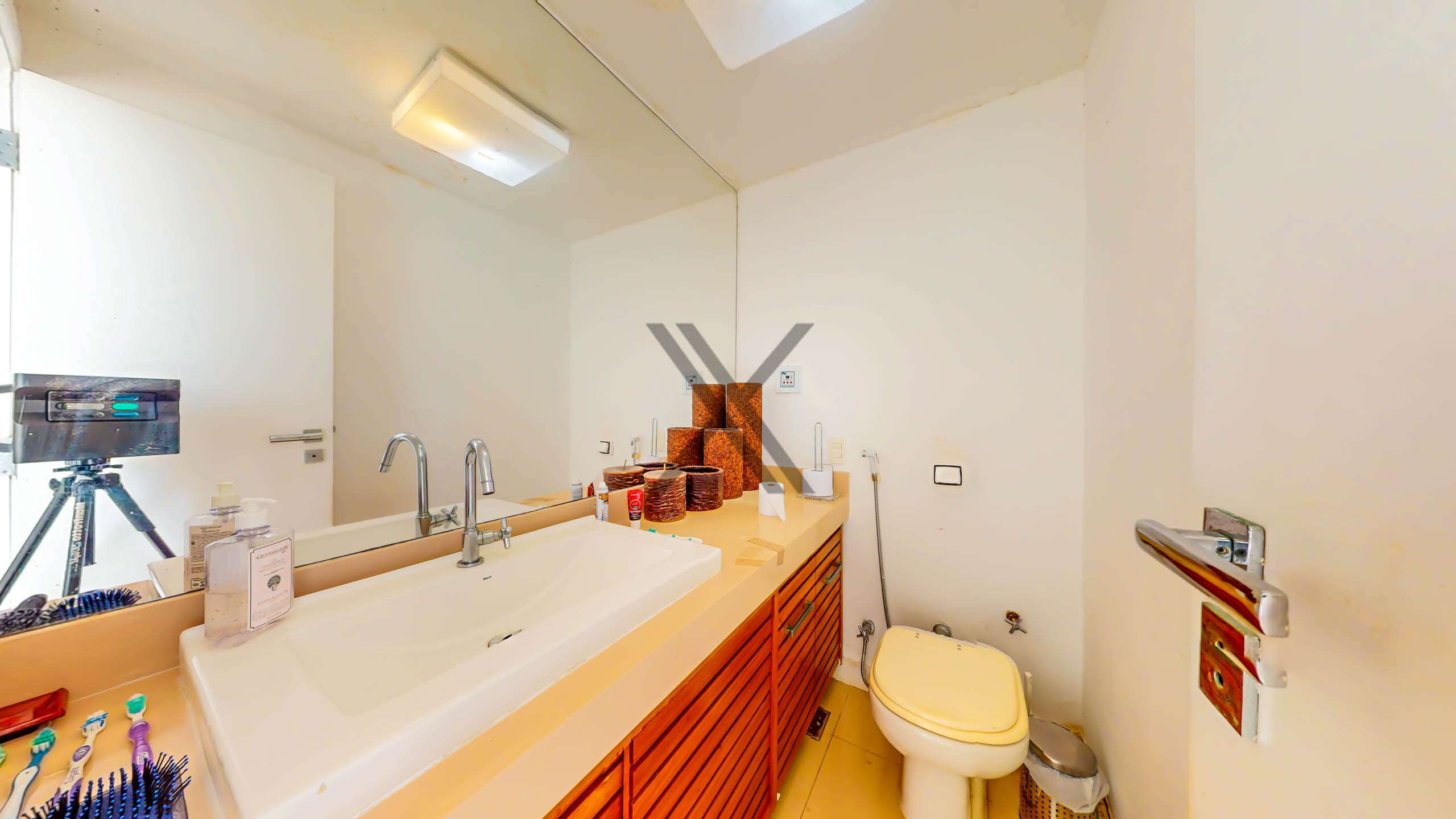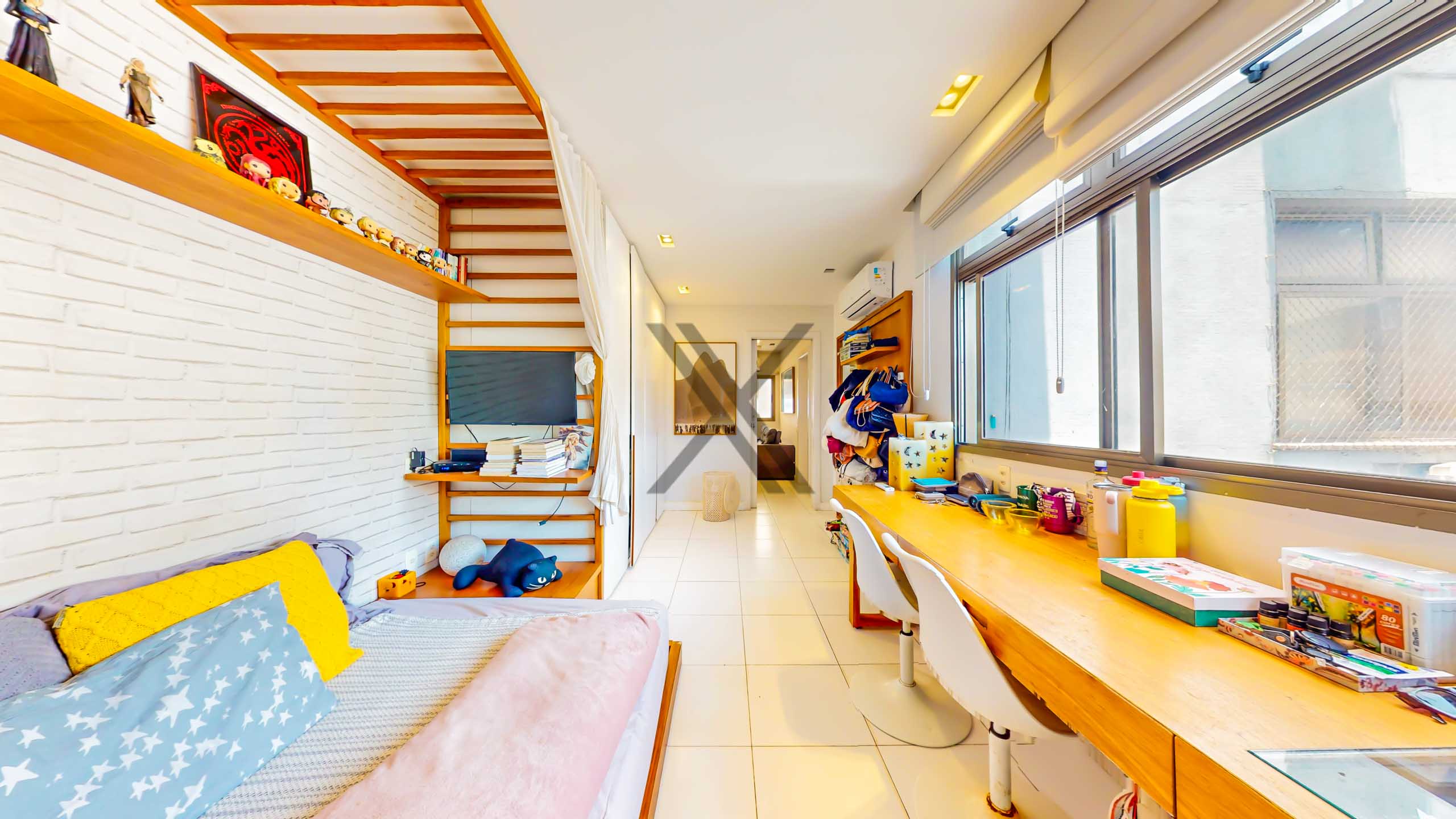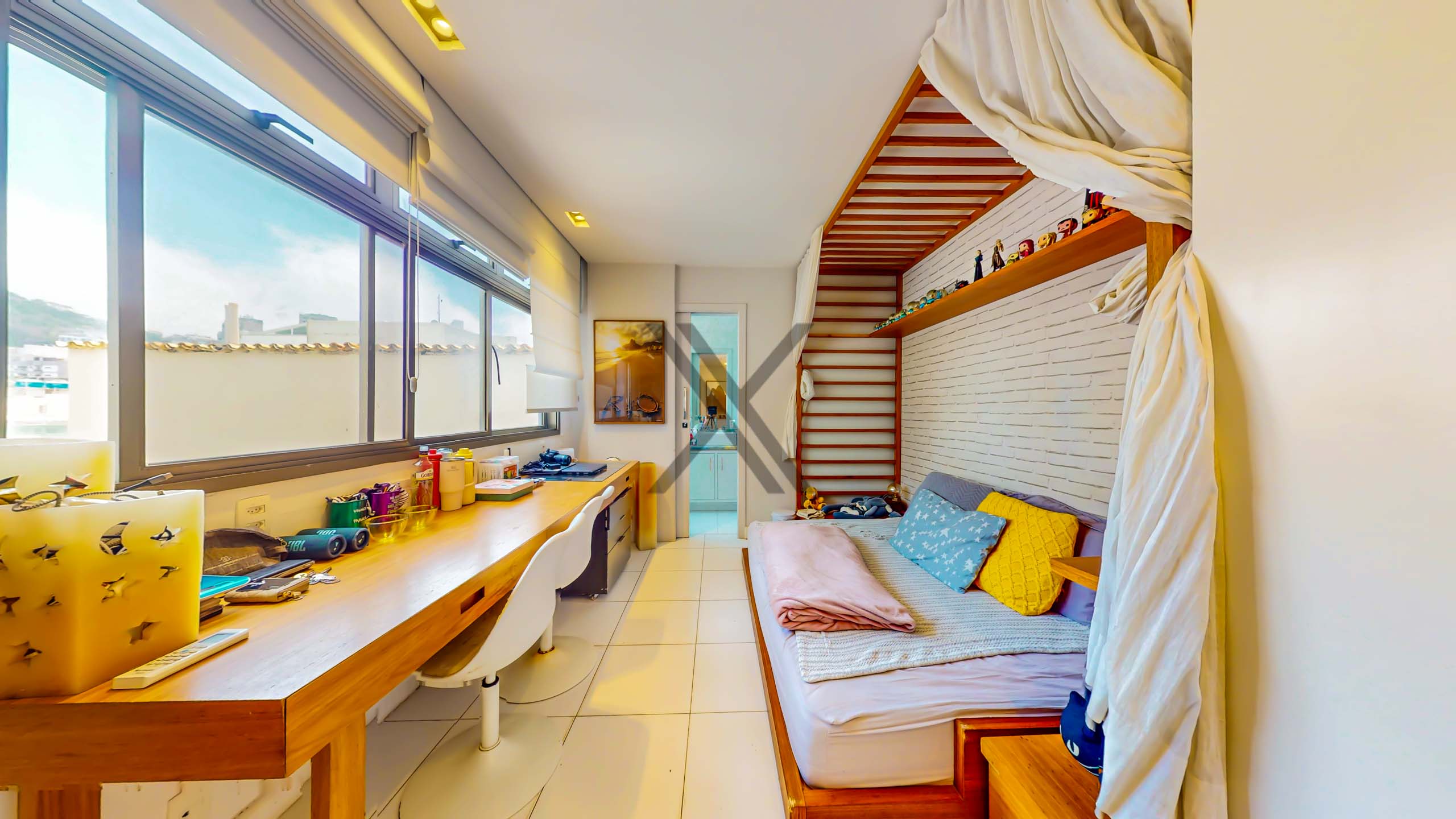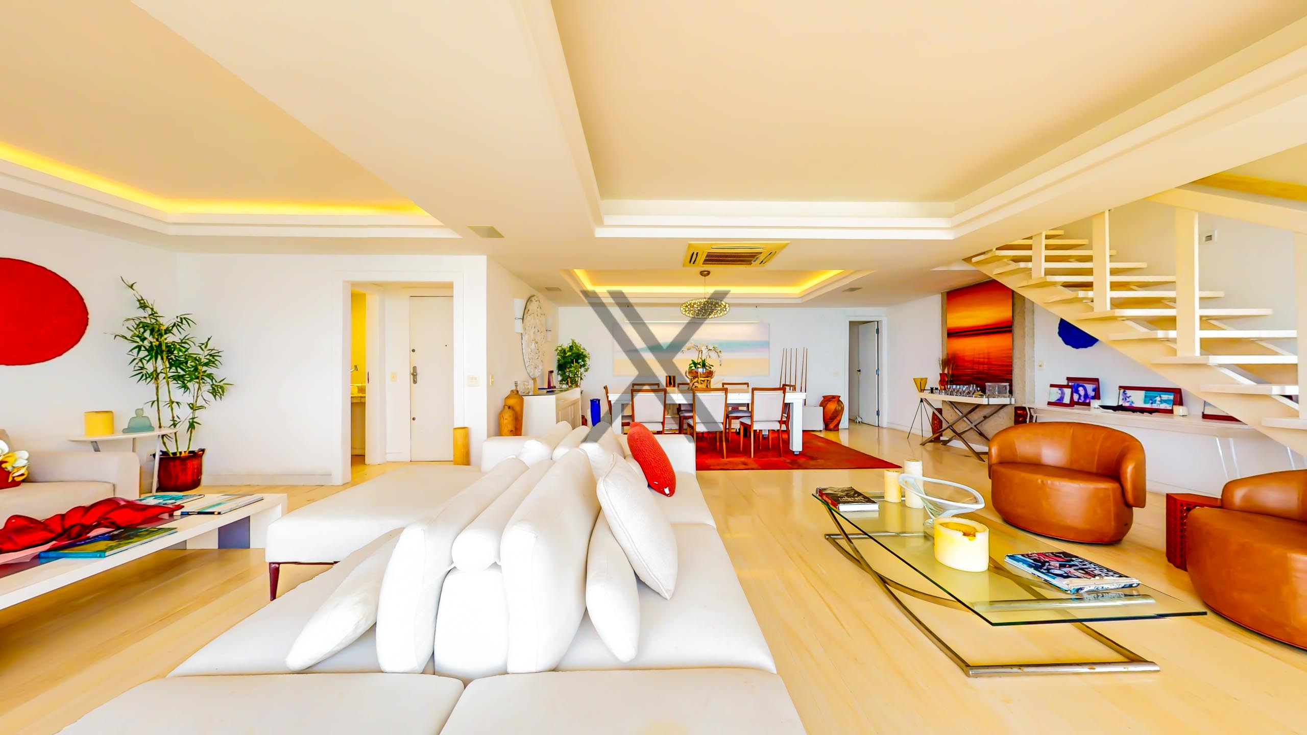 No segundo pavimento encontramos uma ampla sala de convívio, lavabo e suíte master. Originalmente, a área privativa possui 2 suítes, porém ambas foram unificadas, trazendo assim uma generosa metragem para o cômodo. O espaço conta com dois banheiros, walk-in closet e escritório. Na parte externa, temos a área de lazer do imóvel, com churrasqueira, piscina e sauna. Uma vista para o Morro Dois Irmãos e para grande parte da orla do Leblon coroam o ambiente.