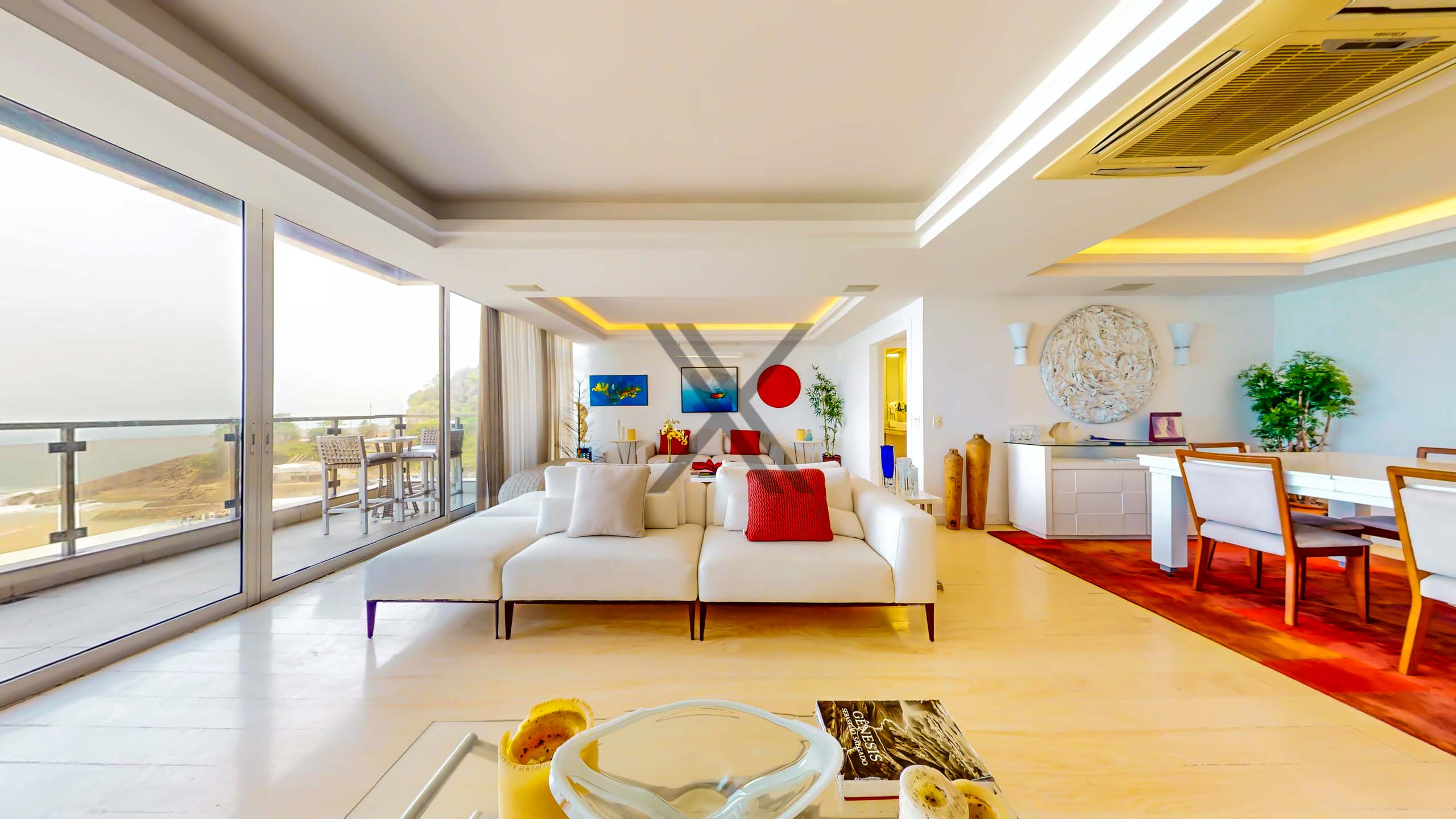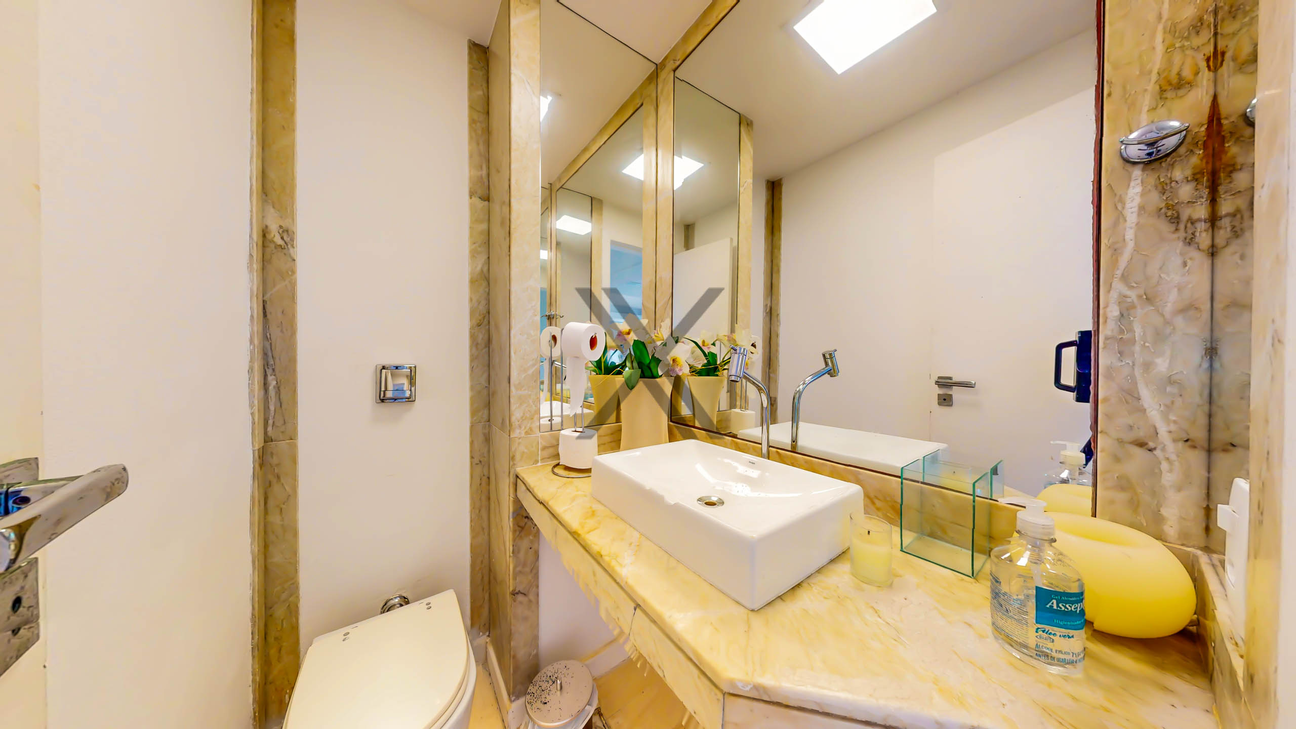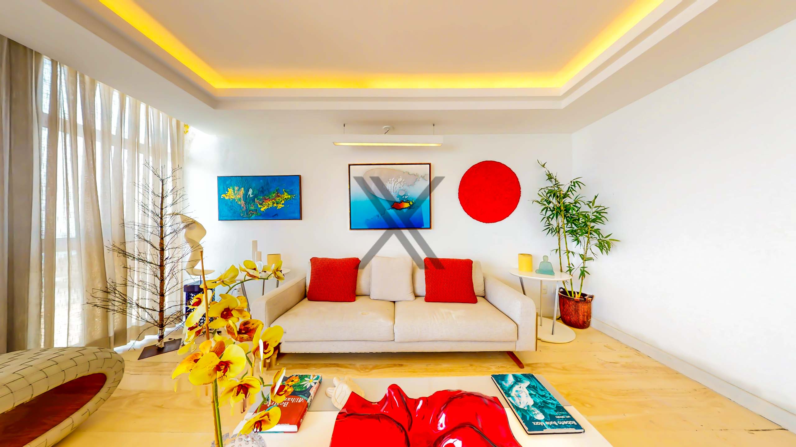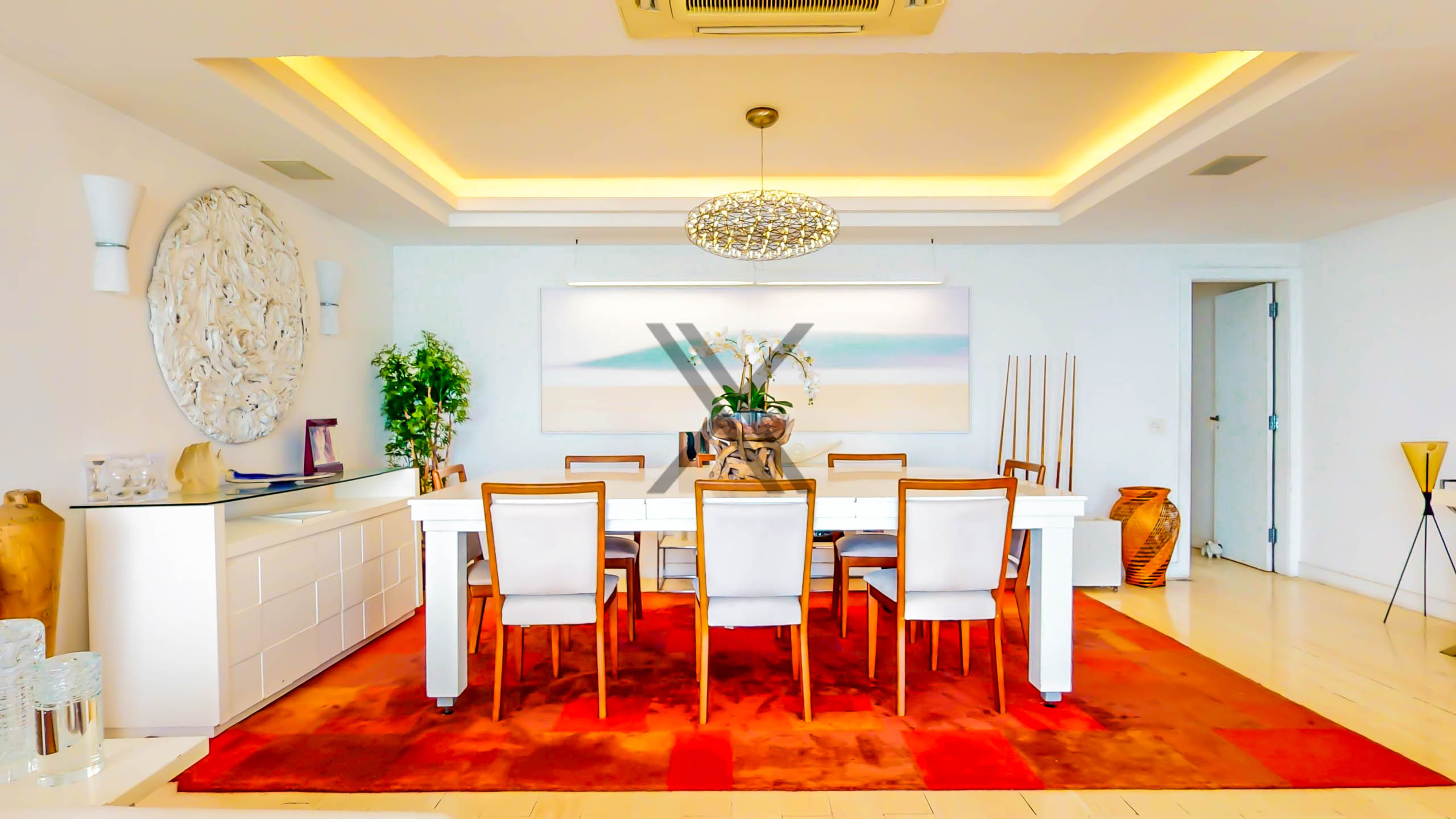 No primeiro pavimento temos a área social do imóvel, com uma excelente sala dividida em 2 amplos e confortáveis ambientes, varanda com vista para o mar, além de projeto luminotécnico e climatização. Um lavabo de apoio complementa o ambiente.