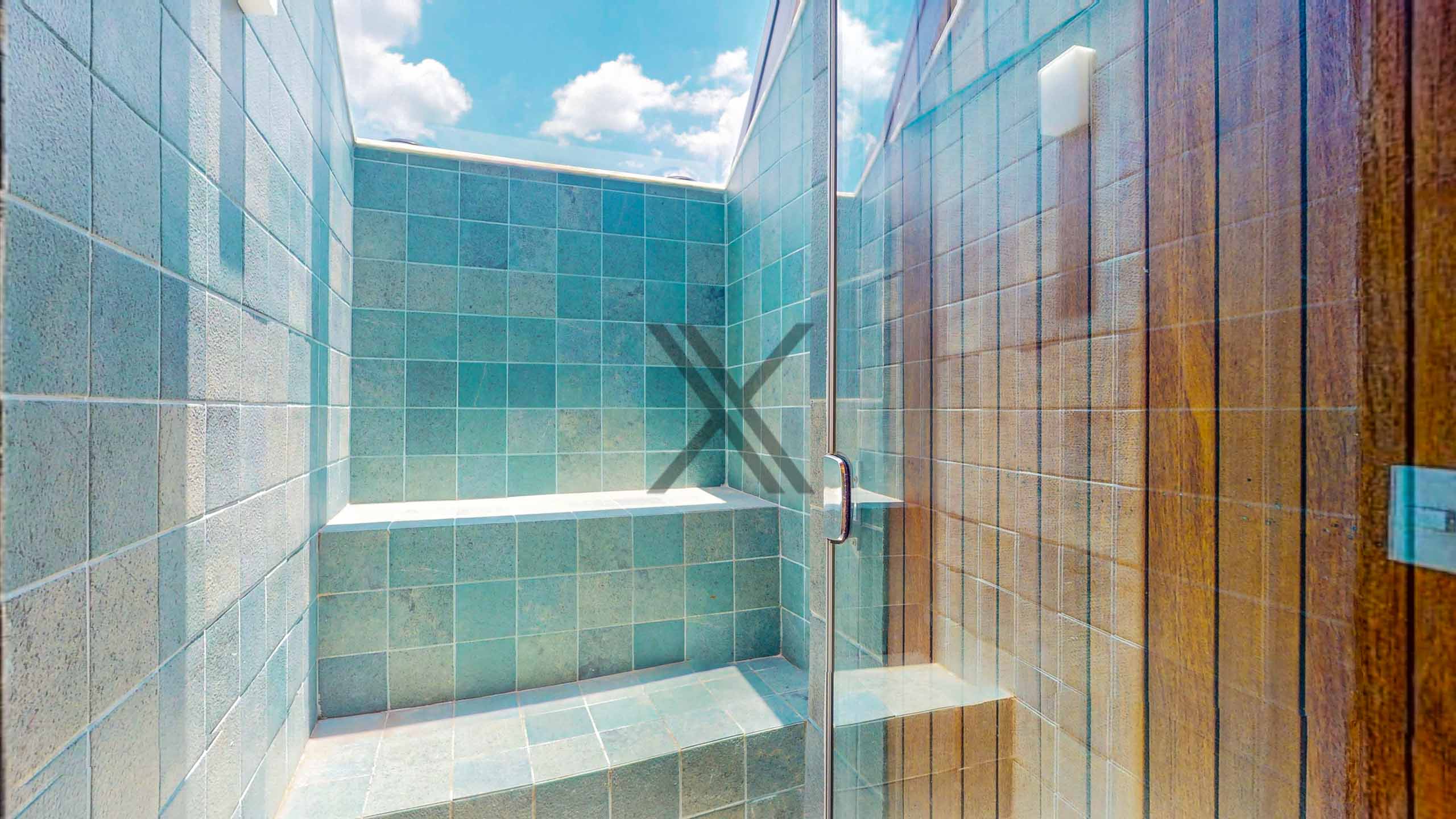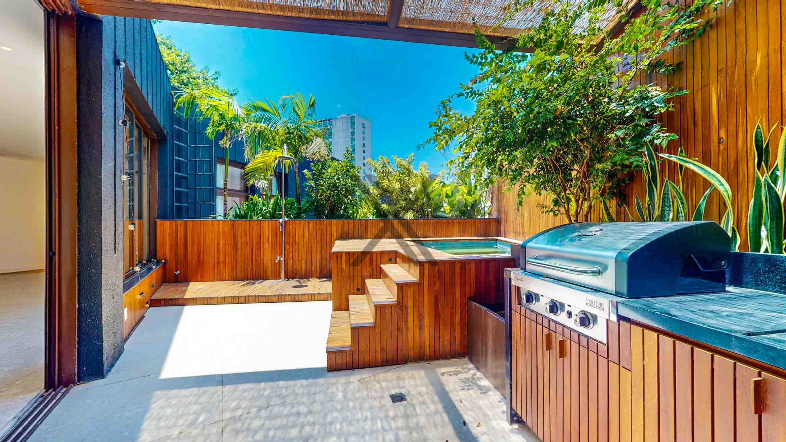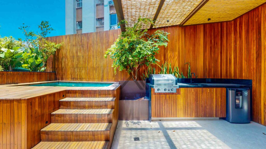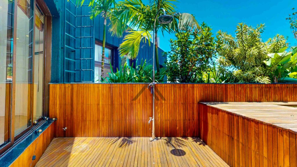 Na parte externa temos a área de lazer do imóvel, composta de piscina em deck, chuveirão, espaço gourmet e sauna.