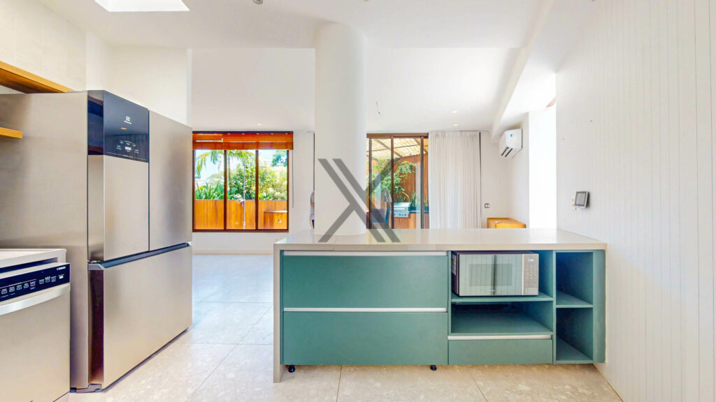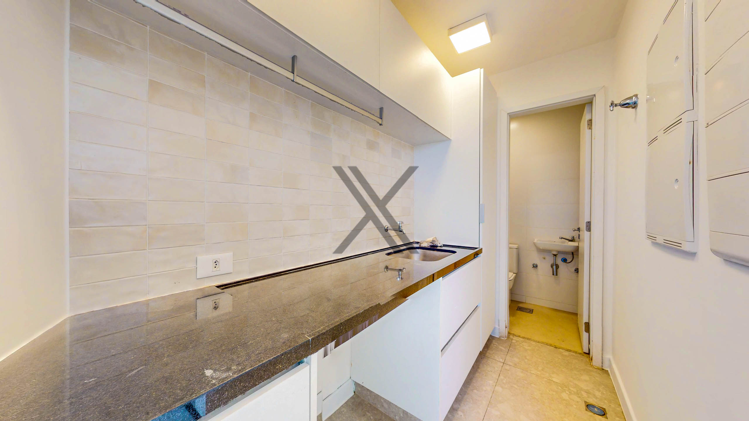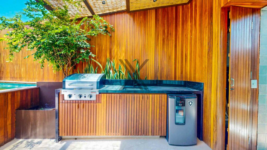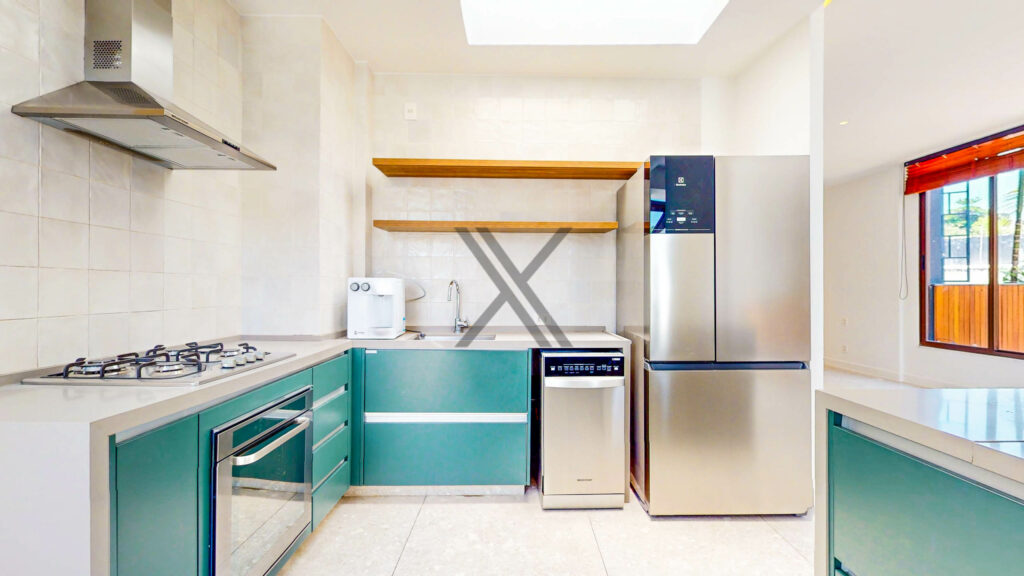 A cozinha, em conceito aberto, possui armários planejados, excelente despensa e eletrodomésticos de ponta como cooktop, coifa e forno. A área de lavanderia está separada e conta também com banheiro para funcionários.