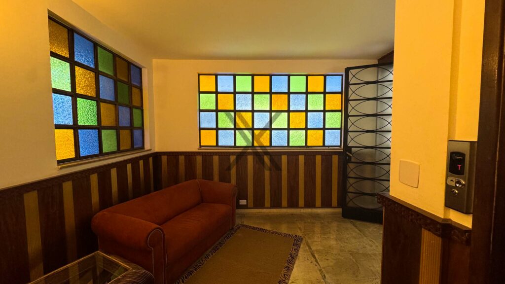 No primeiro pavimento temos a área social do imóvel, com uma sala dividida em 2 ambientes confortáveis, amplas janelas que trazem bastante luz natural, além de projeto luminotécnico, climatização e marcenaria de primeira, além de um lavabo de apoio. Um extenso corredor dá acesso a uma belíssima sala de jantar, com mesa para 8 lugares, adega e louceiro.