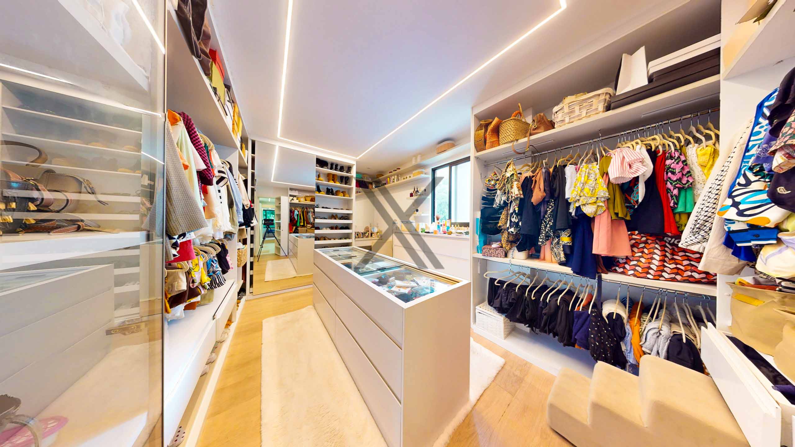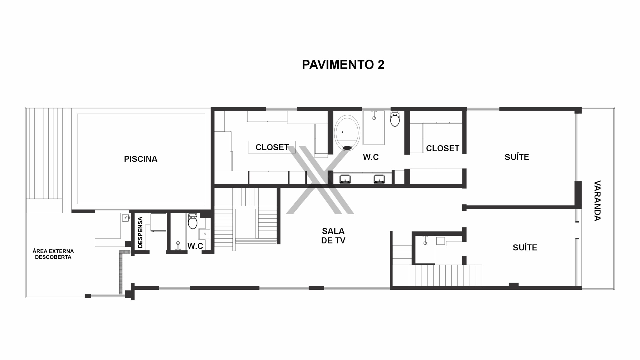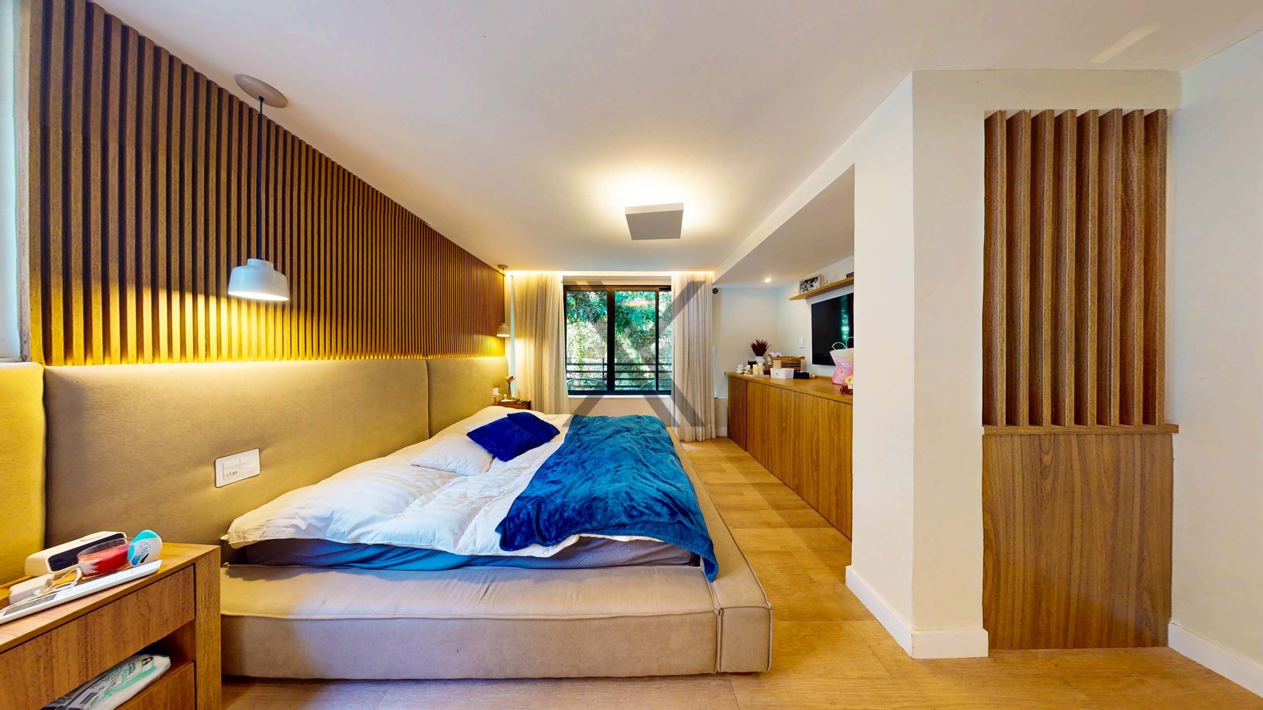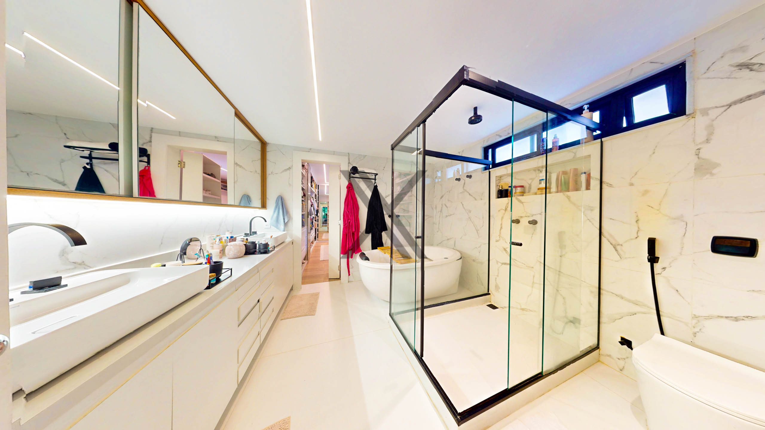 No segundo pavimento, encontramos uma ampla sala de TV, banheiro social e despensa. A área privativa apresenta 2 suítes, sendo a master com espaçoso walk-in closet duplo e um banheiro com banheira e pia dupla. A segunda suíte está formatada como escritório e têm acesso a uma varanda privativa com vista para o verde.