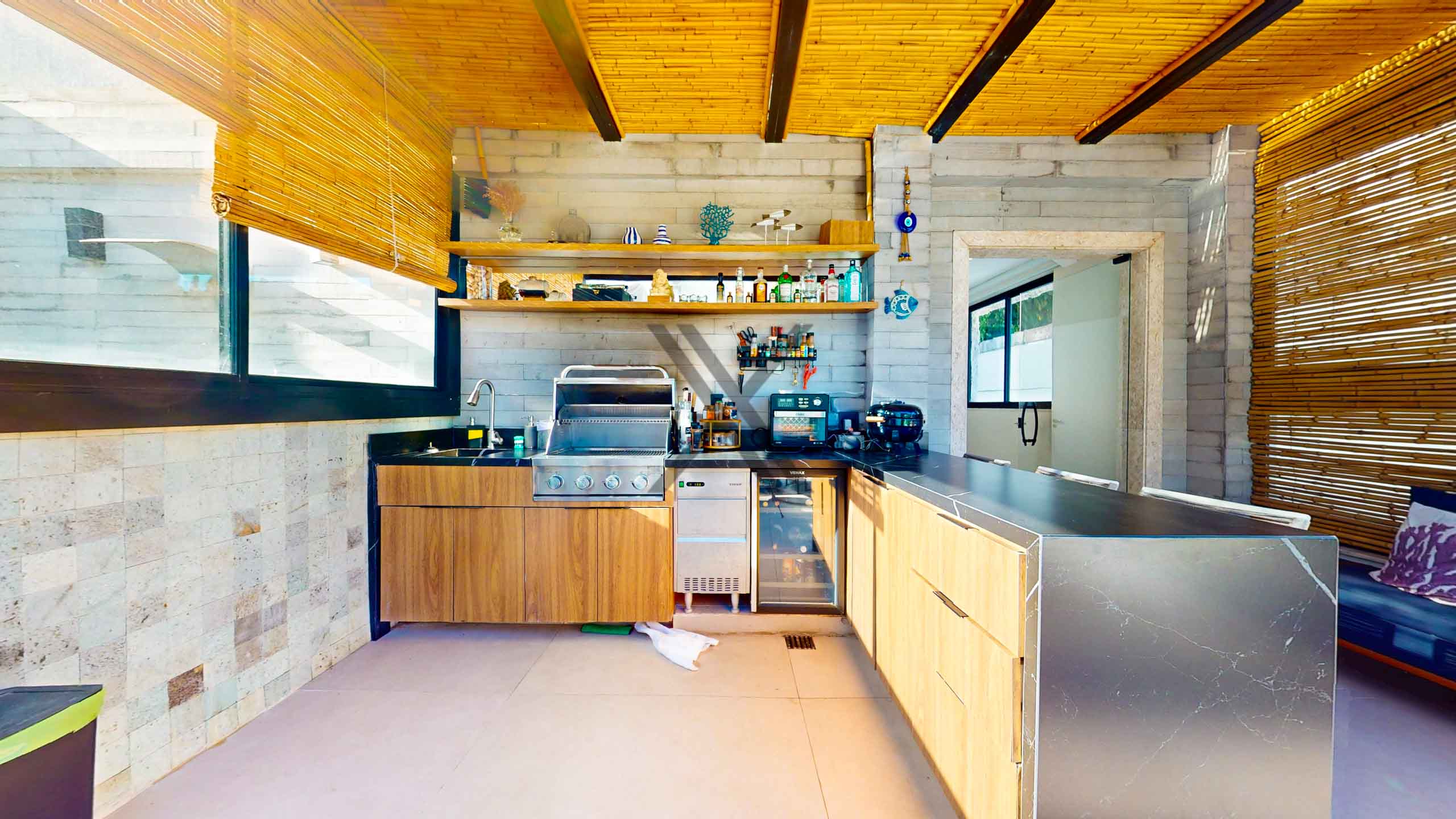 A cozinha, em conceito aberto, traz comodidade e versatilidade para o dia a dia dos moradores. Possui armários em toda sua extensão e longas bancadas para apoio e organização, as quais garantem bastante espaço de armazenamento. Temos também uma ilha com cooktop e coifa, pia inox e forno, todos de excelente qualidade. A área de lavanderia está separada da cozinha e conta com armários e espaço para máquina lava e seca. Uma dependência completa para funcionários complementa o ambiente.