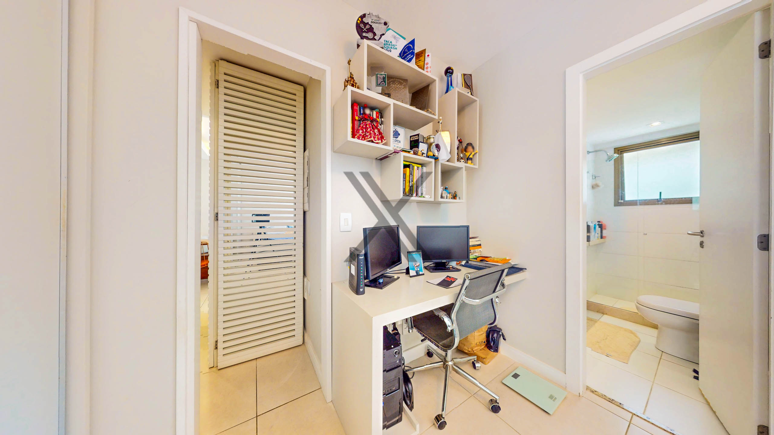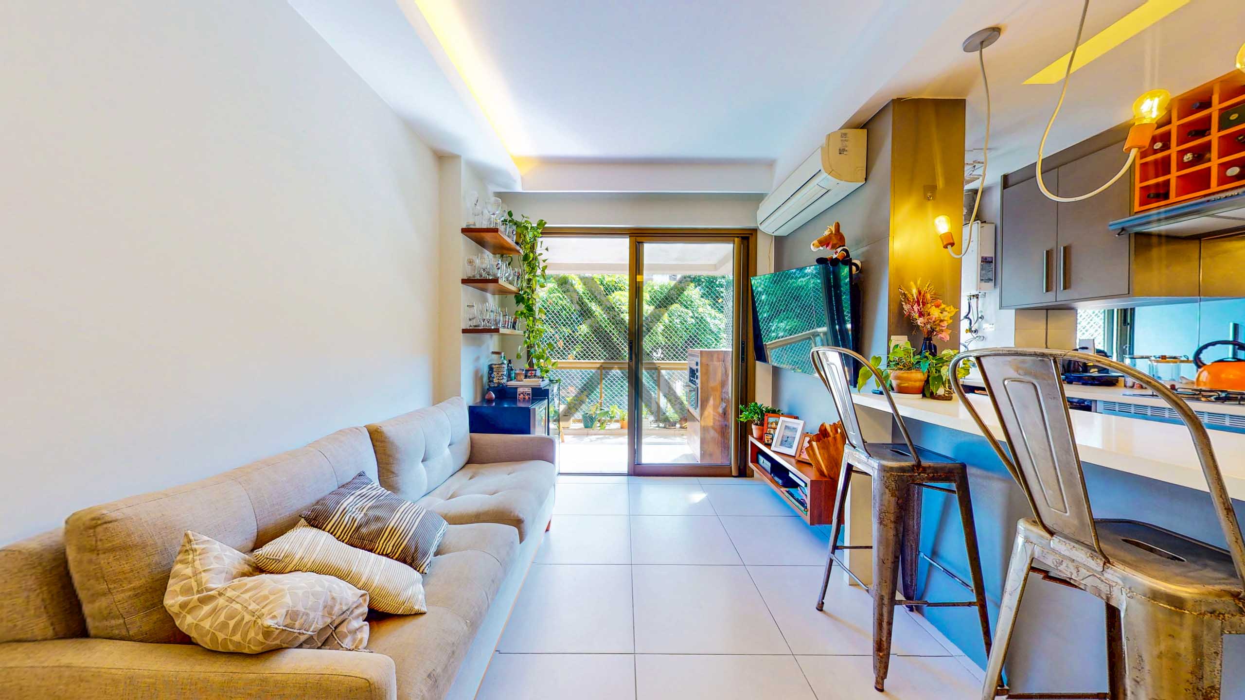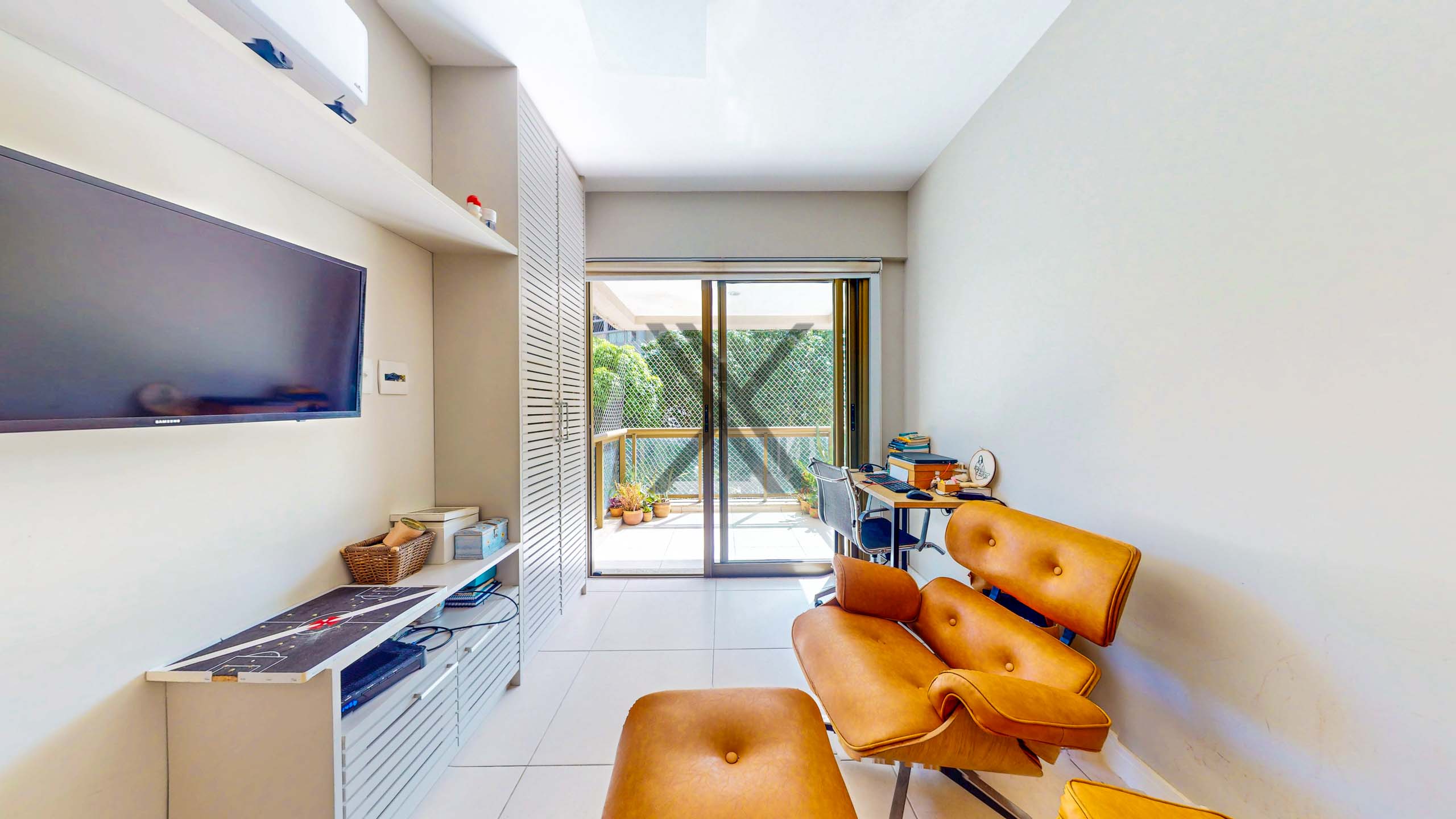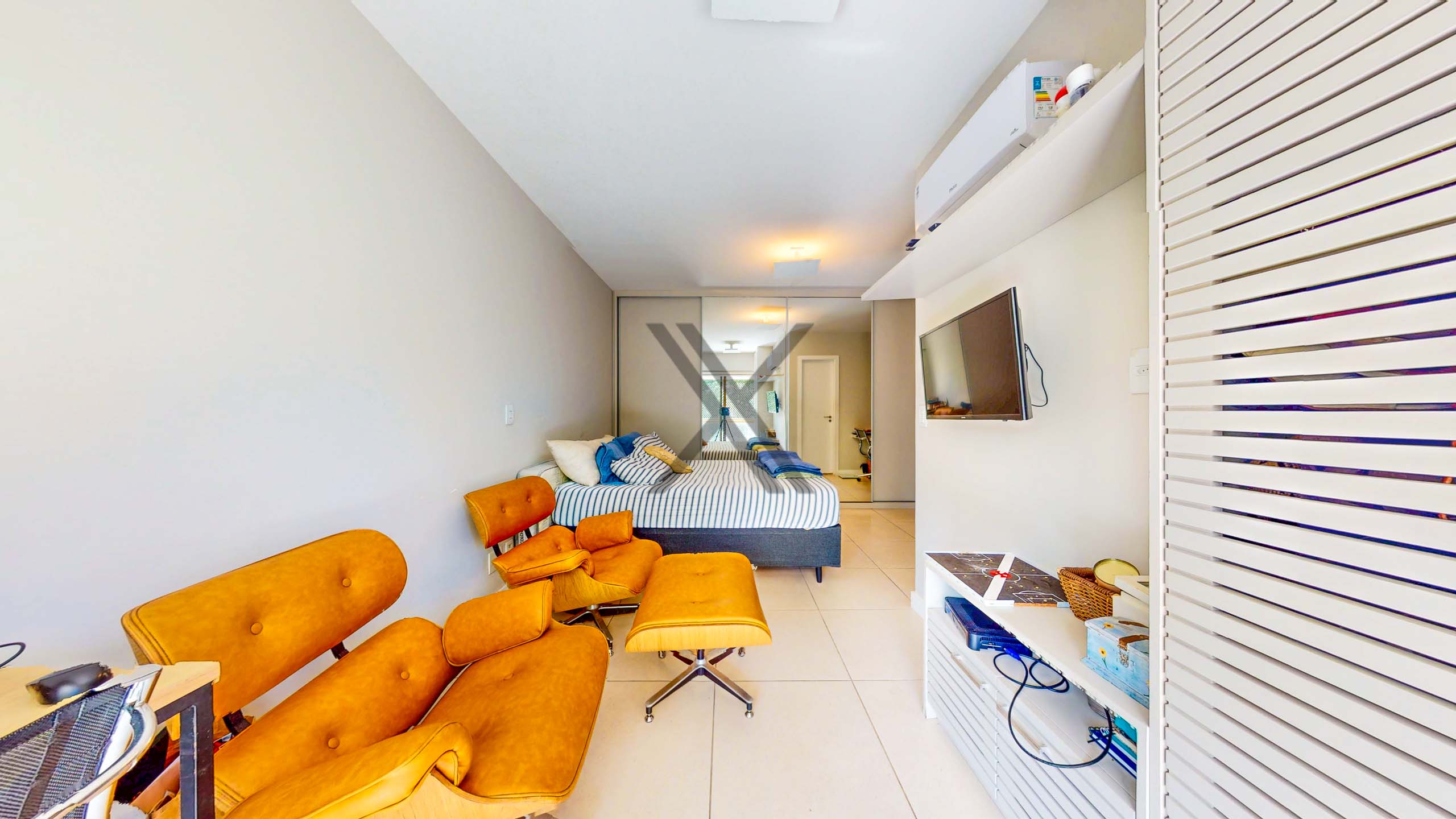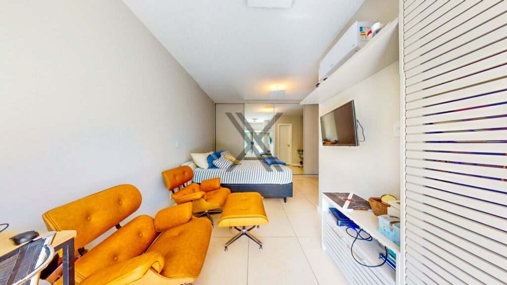 Na área privativa há dois quartos, sendo 1 suíte, todos com armários sob medida, ar-condicionado split, boa iluminação natural e ótimo espaço de armazenagem. A suíte possui um bom tamanho e conta com uma varanda, que pode facilmente ser integrada ao quarto. Por fim, temos um banheiro social em apoio ao quarto e à área social.