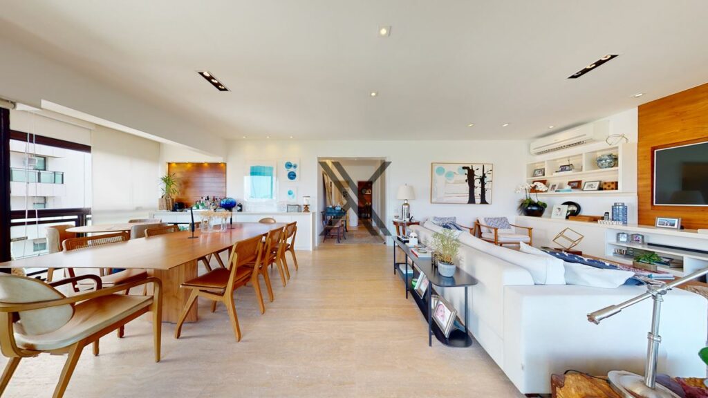 Todos os ambientes contam com aparelhos de ar-condicionado split instalados, em um projeto que visa o conforto térmico em todo o imóvel. Os acabamentos são de altíssimo padrão e de muito bom gosto. Desse modo, o apartamento conta com piso em mármore travertino na sala, nas varandas que foram integradas/niveladas e no corredor.