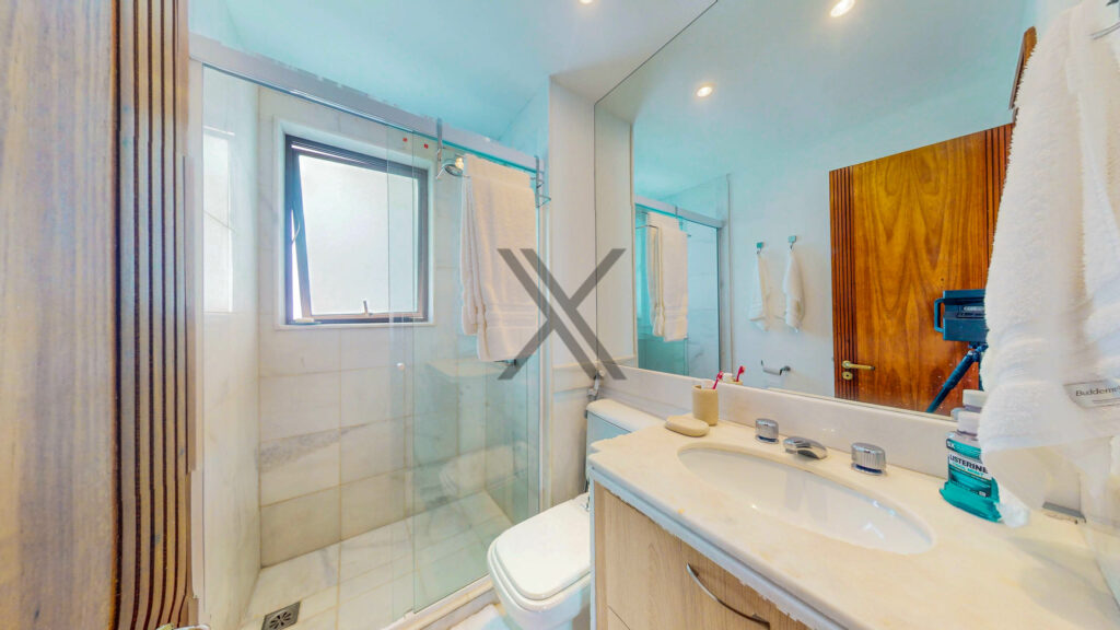 Na parte privativa, o imóvel possui 2 quartos, sendo uma suíte ampla, com vista para o mar e belo banheiro com ventilação natural. O outro quarto também conta com vista para o mar e com uma grande quantidade de armários. O piso da área privativa é todo em Durafloor.