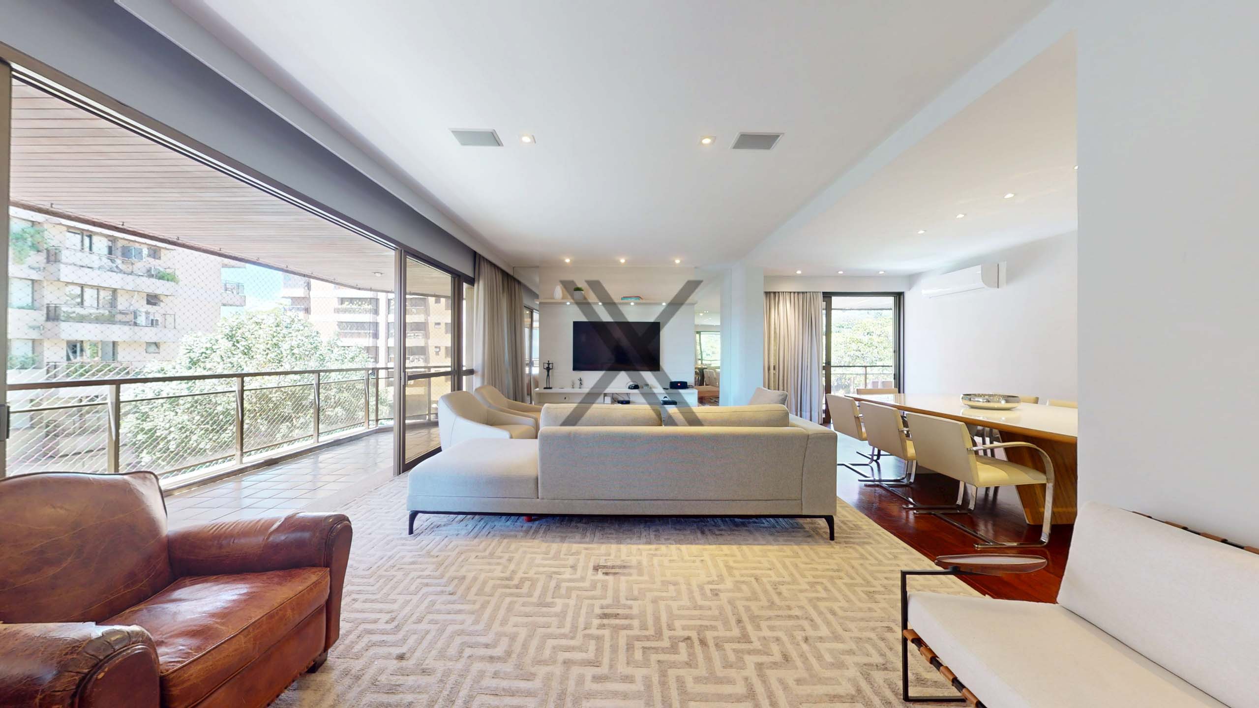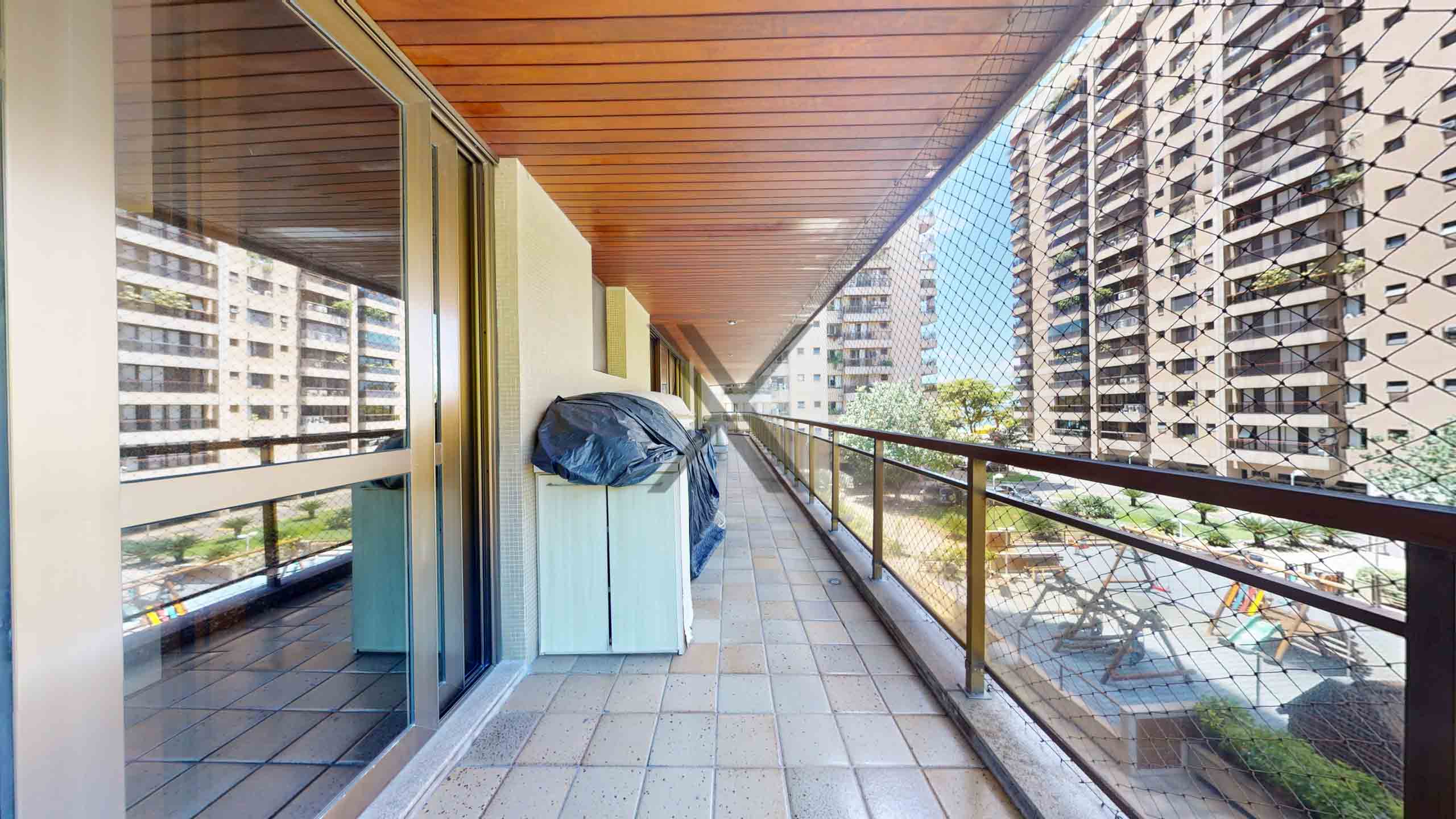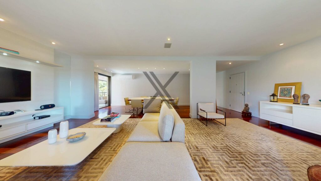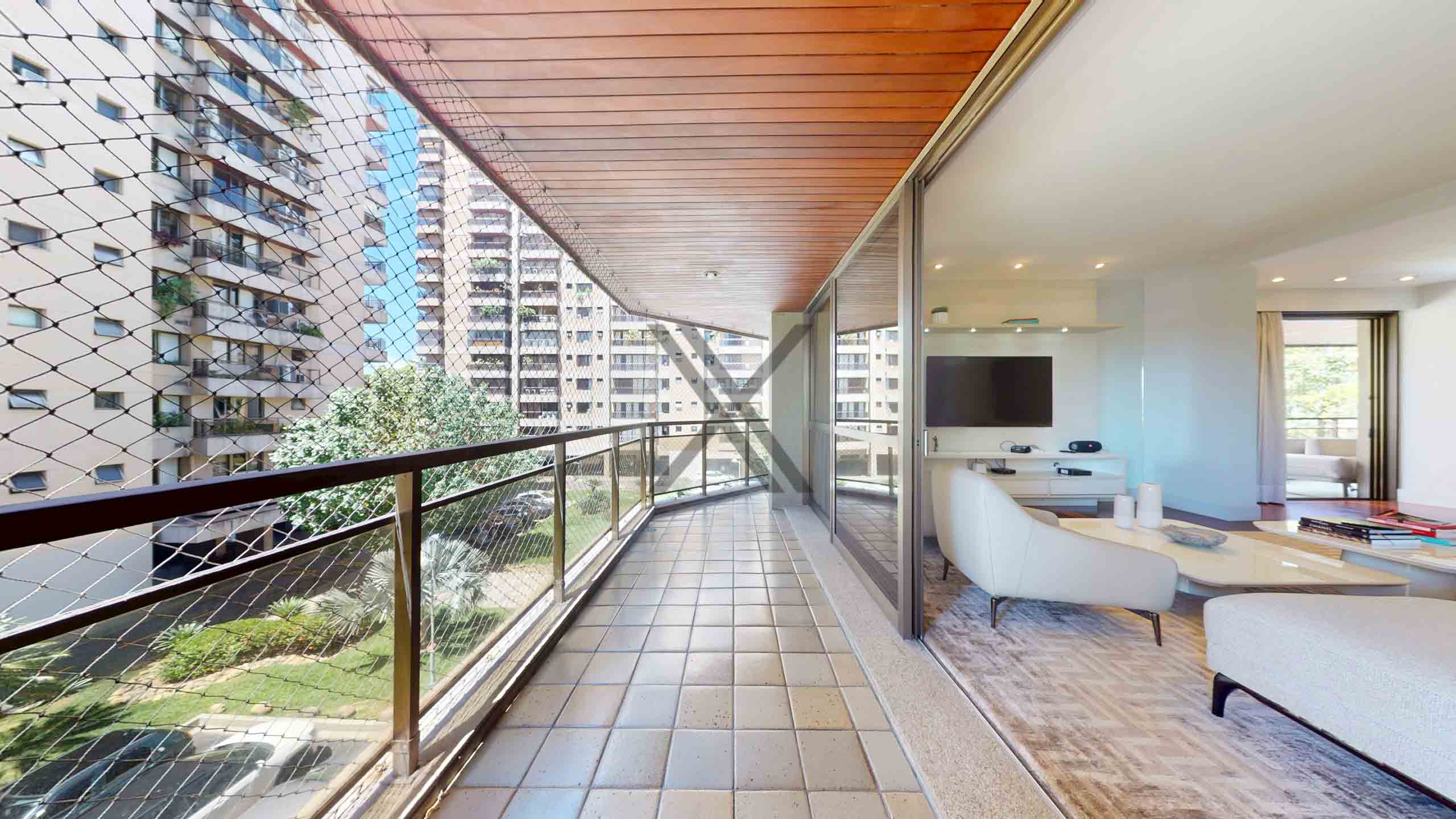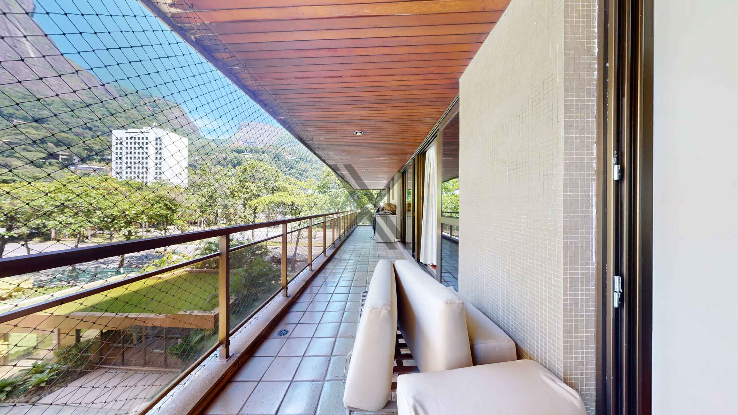 A área privativa possui uma sala de estar com 70m² em três ambientes, extensa varanda que circula toda área social e privativa com vista para o mar e Pedra da Gávea e um lavabo de apoio às visitas.