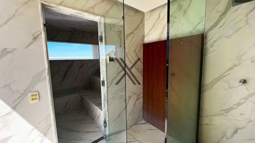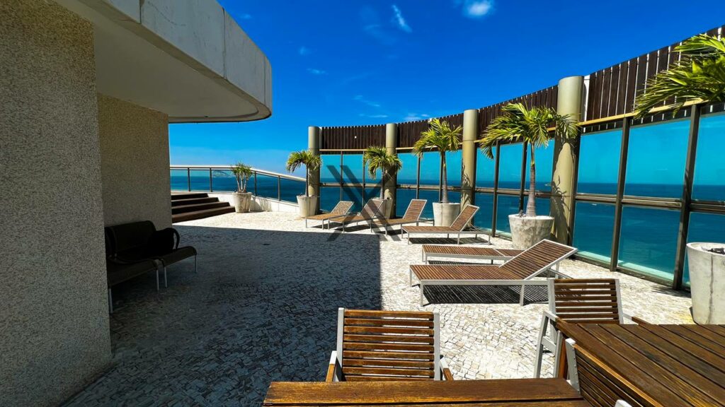 A parte privativa possui 2 quartos, sendo ambos suítes. A suíte master é um show à parte, pois conta com vista livre para o mar, além de dispor de um belo banheiro com ventilação natural. A outra suíte também conta com a mesma linda vista para o mar, grande quantidade de armários e está configurada como uma sala íntima de TV.